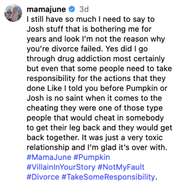 In response to the clip, which June reposted to her Instagram page, June told fans that while she still has “so much” that she needs to say to Josh– stuff she claims that has been bothering her “for years”– she maintains that she’s not the reason that his marriage to Pumpkin failed.