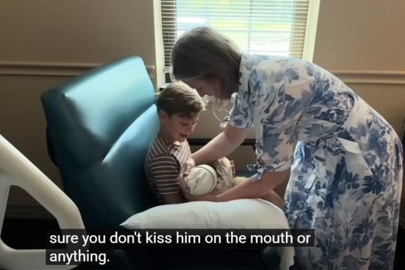 Henry is the first kid to hold the new baby. Ben instructs him not to kiss the baby “on the mouth.”