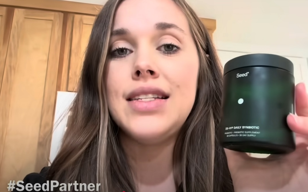 Next, Jessa uses this opportunity to shill some random gut health elixir. She tells us that taking this special snake oil keeps her and the kids from getting sick, so it’s fine if they breathe and paw all over poor Baby Rainbow Print.