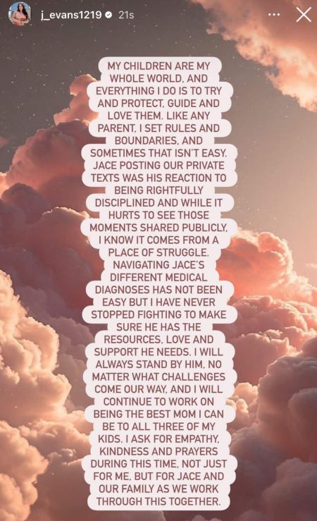 “Jace posting our private texts was his reaction to being rightfully disciplined,” Jenelle wrote. “While it hurts to see those moments shared publicly, I know it comes from a place of struggle. Navigating Jace’s different medical diagnoses has not been easy but I have never stopped fighting to make sure he has the resources, love and support he needs…