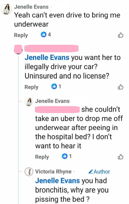 “She couldn’t take an Uber to drop me off underwear after peeing in the hospital bed?” Jenelle wrote. “I don’t want to hear it.”