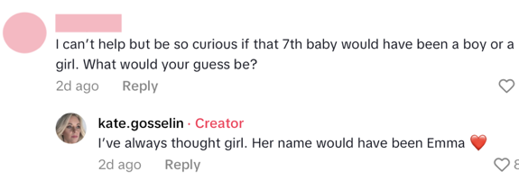 Despite experiencing the loss early in her pregnancy, Kate went on reveal in the comments that she “always thought” that seventh baby would’ve been a girl.