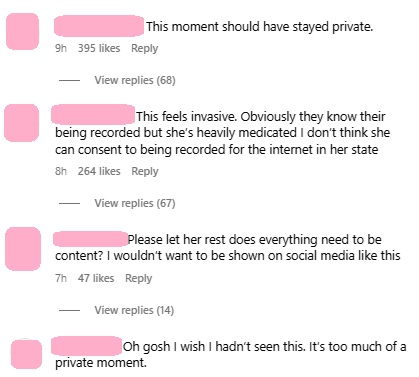 “This feels invasive,” someone else commented. “…she’s heavily medicated I don’t think she can consent to being recorded for the Internet in her state.”