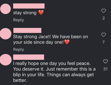 “Stay strong Jace!!” one person commented. “We have been on your side since day one!”