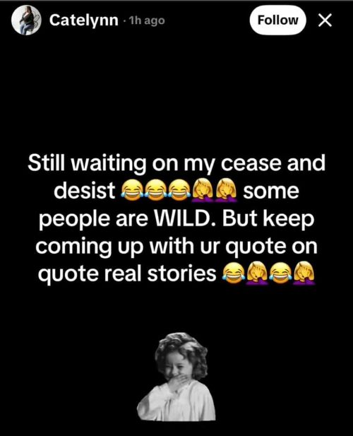 Anyway, on Tuesday, the original TikTok creator addressed Catelynn’s posts that deny she and Ty were legally silenced by Brandon and Teresa, doubling down on her claims and stating the legal action came after the texting scandal and that it was Carly— not Brandon and Teresa— who insisted legal action be taken. She stated that she had not claimed that Cate was ever served a cease-and-desist order, as Catelynn had joked.