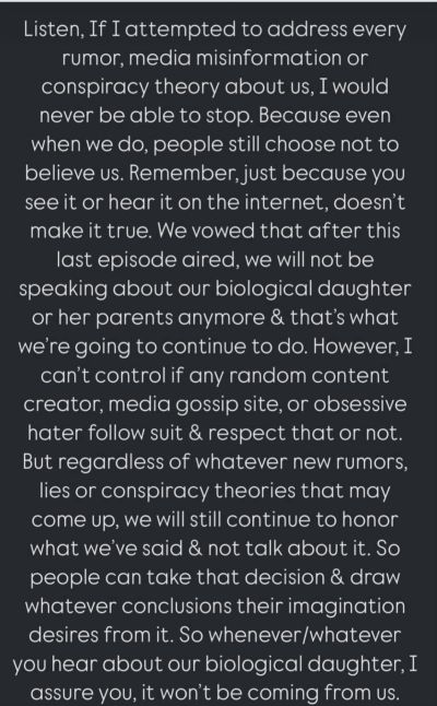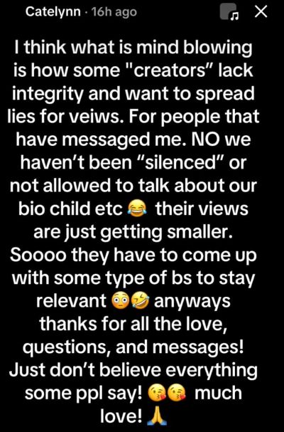 “I think what is mind blowing is how some ‘creators’ lack integrity and want to spread lies for [views],” Cate wrote. “For people that have messaged me. NO we haven’t been ‘silenced’ or not allowed to talk about our bio child etc. [The creator’s] views are just getting smaller. Sooo they have to come up with some type of BS to stay relevant. Anyways, thanks for all the love, questions and messages. Just don’t believe everything some ppl say!”