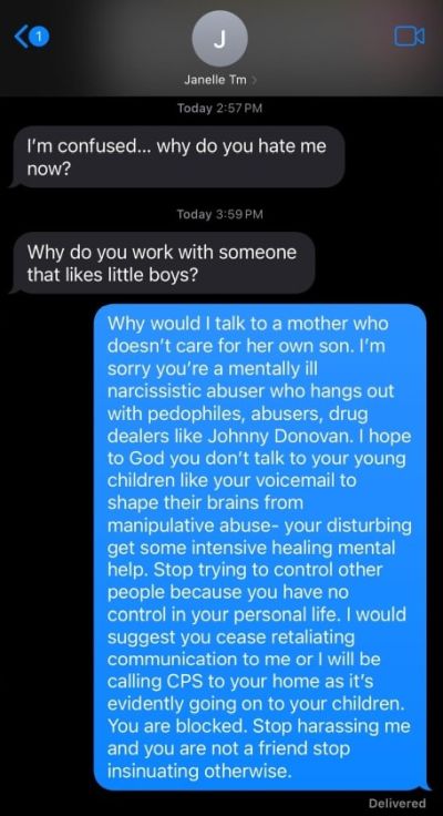“Why would I talk to a mother who doesn’t care for her own son?” Farrah’s texted reply reads. “I’m sorry you’re a mentally ill narcissistic abuser…[You’re] disturbing. Get some intensive mental health. Stop trying to control other people because you have no control in your personal life…”