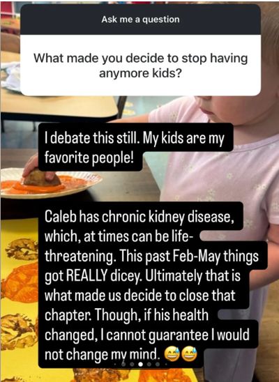 “Caleb has chronic kidney disease, which, at times can be life-threatening,” she wrote. “This past Feb-May got REALLY dicey. Ultimately that is what made us decide to close that chapter [of having kids].