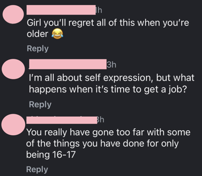 “Girl you’ll regret all of this when you’re older,” one person wrote, with another asking, “I’m all about self-expression, but what happens when it’s time to get a job?”