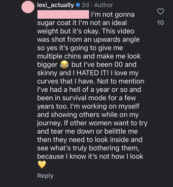 Lexi continued to speak on the unwanted remarks in the comment section of her post, claiming in one that while she may not be “an ideal weight” at the moment, she’s OK with that.