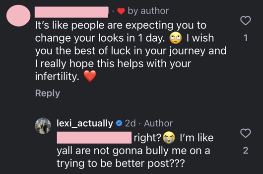 Lexi also “liked” and responded to a comment from someone slamming those who criticized Lexi for being candid about her health journey.