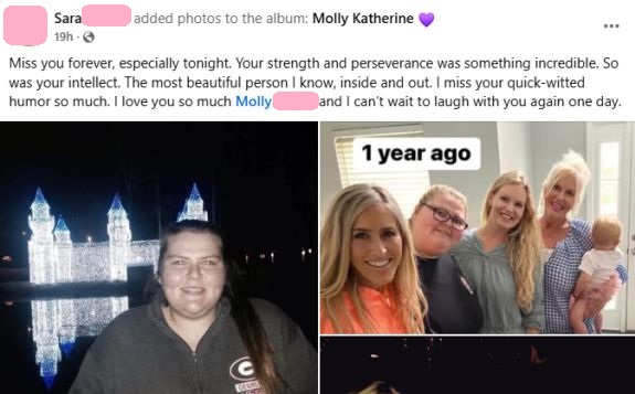 “Miss you forever, especially tonight,” she wrote. “Your strength and perseverance was something incredible. So was your intellect. The most beautiful person I know, inside and out. I miss your quick-witted humor so much. I love you so much Molly and I canāt wait to laugh with you again one day.”