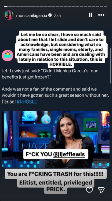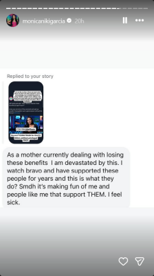 The former Housewife shared some of the responses she’s gotten from followers to her post and Jeff’s comments, including one from a SNAP beneficiary that reads, “As a mother currently dealing with losing these benefits I am devastated by this. I watch Bravo and have supported these people for years and this is what they do? Smdh it’s making fun of me and people like me who support THEM. I feel sick.”