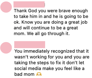 “You immediately recognized that it wasn’t working for you and you are taking steps to fix it,” another added. “Don’t let social media make you feel like a bad mom.”
