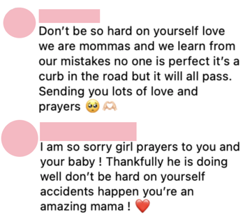 “I am so sorry girl prayers to you and your baby!” another commented. “Thankfully he is doing well don’t be hard on yourself accidents happen you’re an amazing mama!”