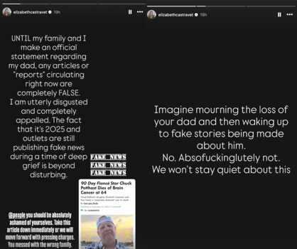 On Monday, Elizabeth also addressed the rumors about her father, telling fans that until she and her family issue a statement regarding Chuck’s cause of death, anything being reported is “completely false.”