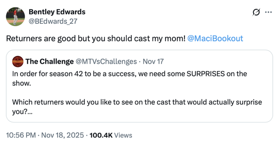 Bentley– who Maci shares with Ryan Edwards– recently took to social media to push for his mom’s new gig in response to a ‘Challenge’ fan page on X discussing ideas for the upcoming season.
