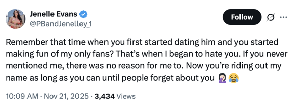 Jenelle has been upping the mom content since Kenleigh, the ex-soulmate of David Eason, attacked her parenting in several Grade A insults posted to X. On Friday, Jenelle posted that she hates Kenleigh (who broke up with David in September) because Kenleigh made fun of Jenelle being on OnlyFans.