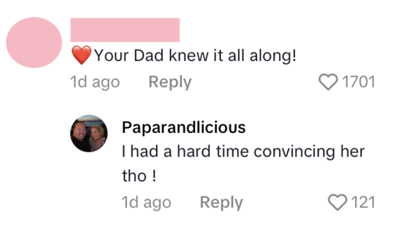 “Your dad knew it all along!” another commented, to which Randy replied, “I had a hard time convincing her tho!”