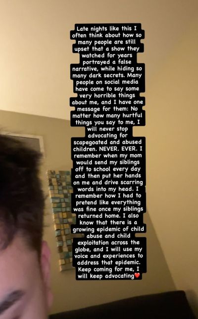 “No matter how many hurtful things you say to me, I will never stop advocating for scapegoated and abused children,” he wrote. “NEVER.EVER… I know that there is a growing epidemic of child abuse and child exploitation across the globe and I will use my voice and experiences to address that epidemic. Keep coming for me, I will keep advocating.”