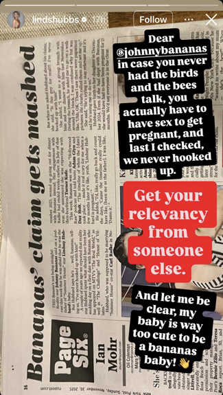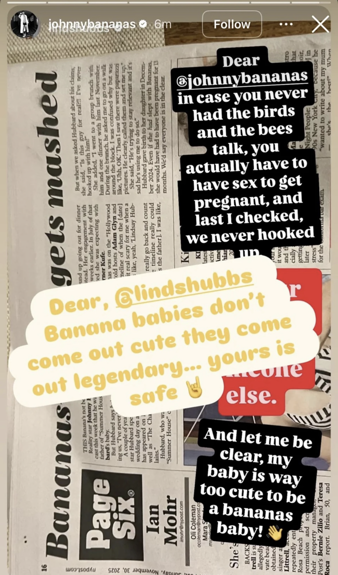 “Dear [Johnny], in case you never had the birds and bees talk, you actually have to have sex to get pregnant, and last I checked, we never hooked up,” she wrote. “Get your relevancy from someone else. And let me be clear, my baby is way too cute to be a bananas baby!”
