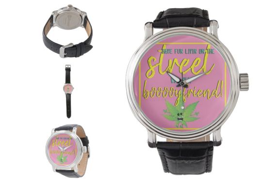If it’s about time for your pal’s mom to kick her out of the house, this is the perfect gift for her! This fine watch gives that special Christmas wish once bellowed by the great Barbara Evans: “Have fun livin’ in the street with your boooooooooyfriend!” This more-classier timepiece even features a cartoon drawing of “tha weeeeeeed” to welcome you to your new life of homelessness.