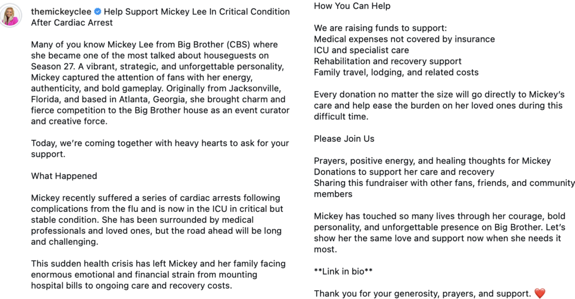 “Mickey has touched so many lives through her courage, bold personality, and unforgettable presence on ‘Big Brother,’” the fundraiser description states. “Let’s show her the same love and support now when she needs it most.”
