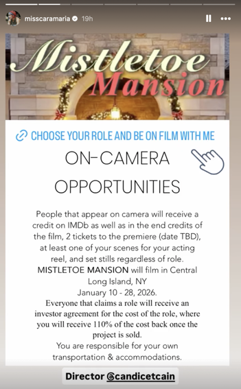 “Wanna be in a movie WITH me?” Cara posted to Instagram. “We are filming in January in Long Island and filling up spots for extras and more. Being in a [Candice Cain] Christmas movie is a DREAM you have to experience.”