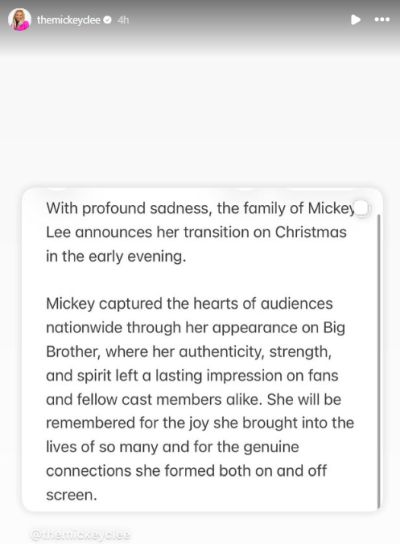 “With profound sadness, the family of Mickey Lee announces her transition on Christmas in the early evening,” the post read.