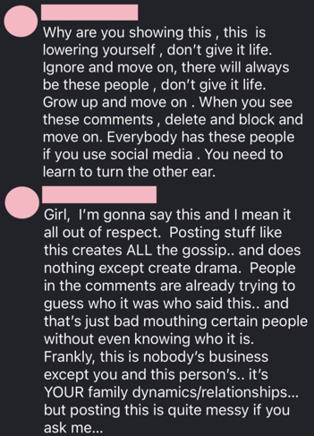 “Frankly, this is nobody’s business except you and this person’s,” they continued. “It’s YOUR family dynamics/relationships… but posting this is quite messy if you ask me… .”