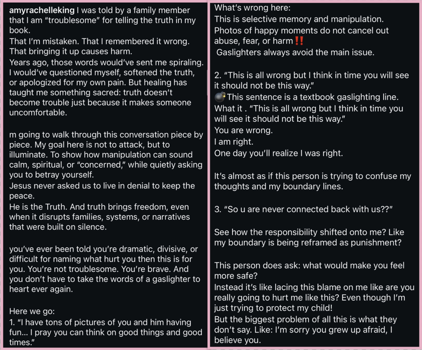 In the caption of her post, Amy claimed that she was told by a family member that she is “troublesome” for sharing her story and that she had misremembered the experiences she wrote about in her book. Amy said that while those words would have sent her “spiraling” years ago, healing has taught her that “truth doesn’t become trouble just because it makes someone uncomfortable.”