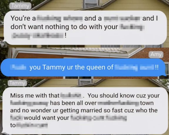 Amy and Tammy proceed to partake in a rapid-fire exchange of nasty name-calling, most of which is blurred by TLC, due to its NSFW content. Among the censored texts is one from Tammy seemingly calling Amy a “f**king wh0re.” In another text, Tammy appears to accuse Amy of sleeping with a lot men in town and claims that Amy is “getting married so fast” because no one– other than Brian– would want her.