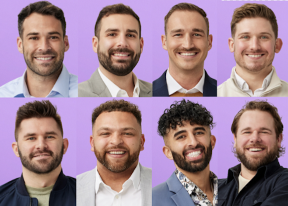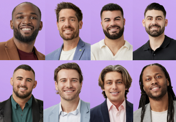 Alex H., 31, a former Division 1 goalkeeper who now works in financial sales; Alex L., 33, an assistant controller who describes himself as a “lovable smart-ass”; Brennan, 30, an accounting and finance manager whose motto in life is, “do hard things”; Chris, 33, an Ironman triathlete and account executive; Connor, 32, an account manager looking for his “ride-or-die” partner; Devo, 32, a loan officer and avid sports fanatic; Haramol, 36, an E.R. doctor and professor looking for someone to love him unconditionally; Jordan, 34, an account executive who’s known as the “life of the party” by friends and family.