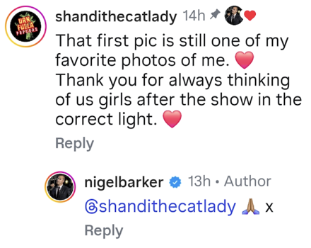 Shandi later left a comment on Nigel’s post, calling the first photo in his carousel, “one of my favorite photos of me.” She also thanked the photographer, “for always thinking of us girls after the show in the correct light.”