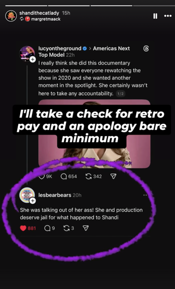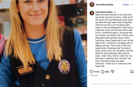 “Watching the new Netflix doc ‘Reality Check: Inside America’s Next Top Model’ you get an extremely raw and true behind the scenes look at Shandi’s story and it’s clear the show could and should have done much better,” he wrote. “Shandi will always be a rockstar.”