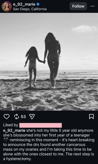 “ … I’m taking this time to be alone with the ones closest to me,” Liz posted to Instagram, alongside a throwback photo of her and her daughter. “The next step is hysterectomy.”