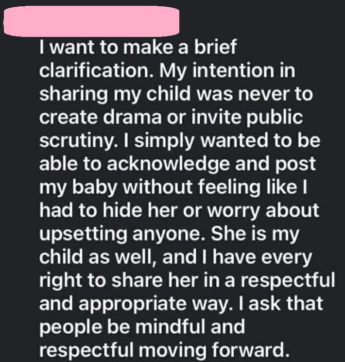 “I want to make a brief clarification,” she wrote. “My intention in sharing my child was never to create drama or invite public scrutiny. I simply wanted to be able to acknowledge and post my baby without feeling like I had to hide her or worry about upsetting anymore. She is my child as well, and I have every right to share her in a respectful and appropriate way. I ask that people be mindful and respectful moving forward.”