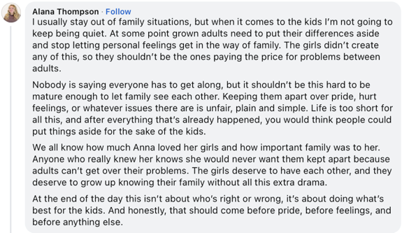“ … Life is too short for all this, and after everything that’s already happened, you would think people could put things aside for the sake of kids,” she wrote. “We all know how much Anna loved her girls and how important family was to her. Anyone who really knew her knows she would never want them kept apart because adults can’t get over their problems. The girls deserve to have each other, and they deserve to grow up knowing their family without all this extra drama.
