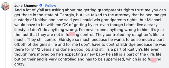 June later commented on her daughter’s post with a screenshot of an alleged exchange between herself and Michael, while continuing to accuse both him and London of trying to control the situation involving Kaitlyn and Kylee. June maintained that Michael is the reason Kylee does not see her mom’s family and in another comment, she confirmed that she can obtain Grandparents’ Rights for Kylee in the state of Georgia, however, Michael would have to be in agreement, which June said he is not.
