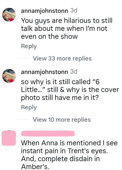 “When Anna is mentioned, I see instant pain in Trent’s eyes. And, complete disdain in Amber’s,” one fan wrote in the post’s comment section. (As fans can recall, Trent finally took accountability and steps to reconcile with Anna at the end of last season.)
