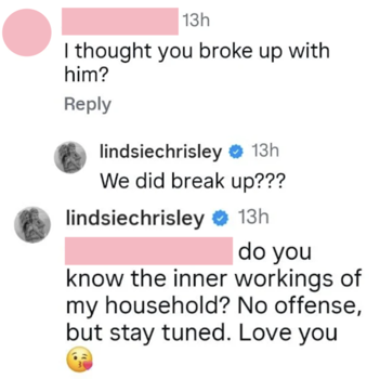 “… do you know the inner workings of my household?” Lindsie wrote. “No offense, but stay tuned. Love you 😘.”