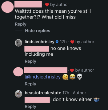 In replies to another comment on David’s post, both he and Lindsie avoided answering whether or not they were back– or still– together.