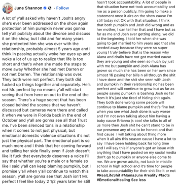 In the caption of her post, June (using her signature “June Speak”) provided fans with additional context to the former couple’s split, which she claimed Pumpkin never planned to discuss on-camera, despite the fact that Pumpkin allegedly spent “many years” protecting Josh and was “over with the relationship” nearly five years before she and Josh called it quits.
