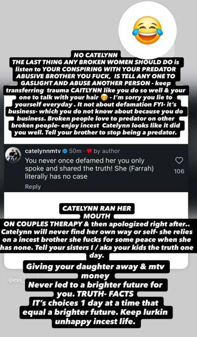 “No Catelynn the last thing any broken women should do is listen to your conspiring with your predator abusive brother you f**k, is tell anyone to gaslight and abuse another person. Keep transferring trauma CAITLYNN like you do so well & your own to talk with your hair.”