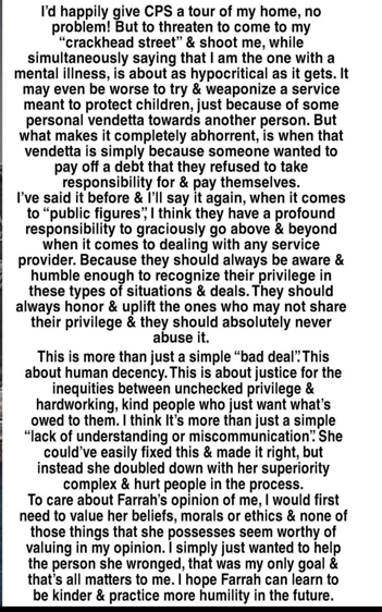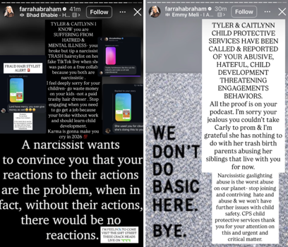 In another post, Farrah claimed that she had contacted Child Protective Services (CPS) to report Tyler and Catelynn for their “abusive, hateful, child development threatening engagements behaviors,” before going on to reference the couple’s biological daughter, Carly, whom they placed for adoption in 2009.