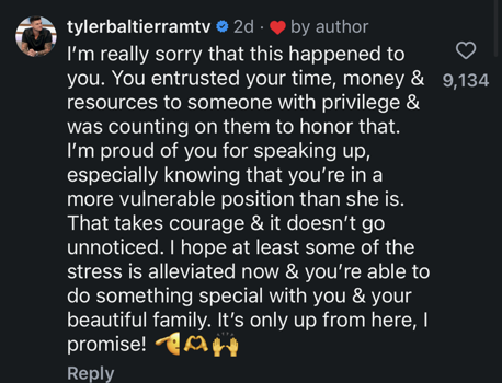 “I’m really sorry that this happened to you,” Tyler wrote. “You entrusted your time, money & resources to someone with privilege & was counting on them to honor that. I’m proud of you for speaking up, especially knowing that you’re in a more vulnerable position than she is. That takes courage & it doesn’t go unnoticed. I hope at least some of the stress is alleviated now & you’re able to do something special with you & your beautiful family. It’s only up from here, I promise!”