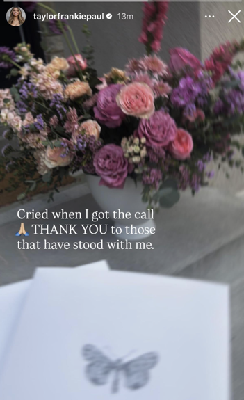 On Tuesday, Taylor posted a photo of a bouquet of flowers on her Instagram Story, writing, “Cried when I got the call! THANK YOU to those that have stood with me.”