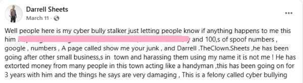 “Well people here is my cyber bully stalker just letting people know if anything happens to me this [is] him,” Darrell wrote, before naming two people he claimed had made social media accounts to impersonate and harass him. Darrell claimed one of the people had “extorted money from many people in this town acting like a handyman” for three years.